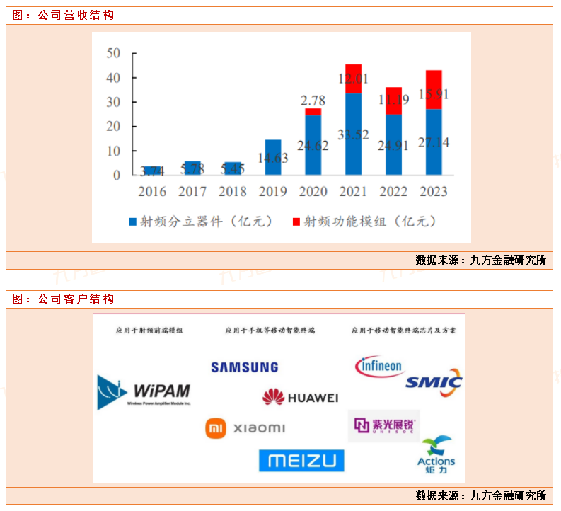 卓胜微公司简介:公司于2013年从电视芯片业务转向射频前端芯片的设计与制造,将目光投向更有发展前景的智能手机领域。公司是国内射频前端龙头企业,专注于射频集成电路领域的研究、开发、生产与销售,主要向市场提供射频前端分立器件以及各类射频前端模组产品解决方案。卓胜微为代表的介于Fabless和IDM模式之间的Fablite模式,即部分产品采用IDM模式,部分产品采用Fabless模式。卓胜微主要客户包括小米,OPPO,vivo,华为,荣耀,三星,目前已经基本实现国内安卓手机品牌的全覆盖。