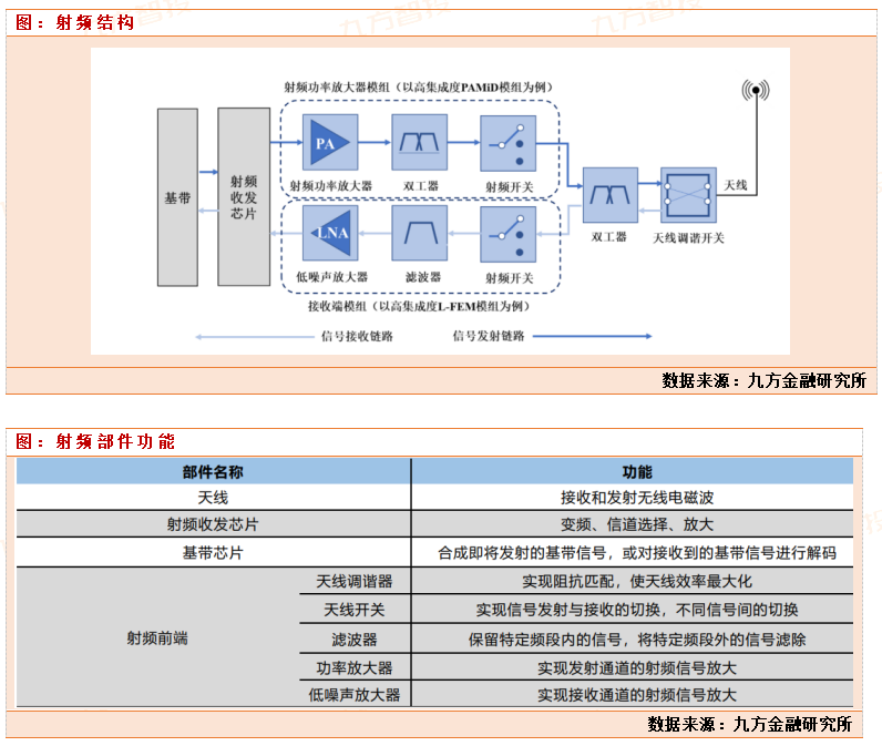 射频是一种高频交流变化电磁波的简称,可以辐射到空间的电磁频率,频率范围在300kHz~300GHz之间。射频主要用于实现无线通迅的两个基本功能—信号的接收和发射。简单说就是将二进制信号,转化为高频无线电磁波并发送出去,和将无线电磁波接收后转化为二进制信号。智能手机通信系统的射频模块一般包括天线、射频前端和射频芯片,主要负责高频无线电波的接收、发射以及处理;其中天线主要负责射频信号和电磁信号之间的相互转化,射频芯片主要负责射频信号和基带信号之间的相互转化,射频前端则主要负责将接收和发射的射频信号进行放大和滤波。