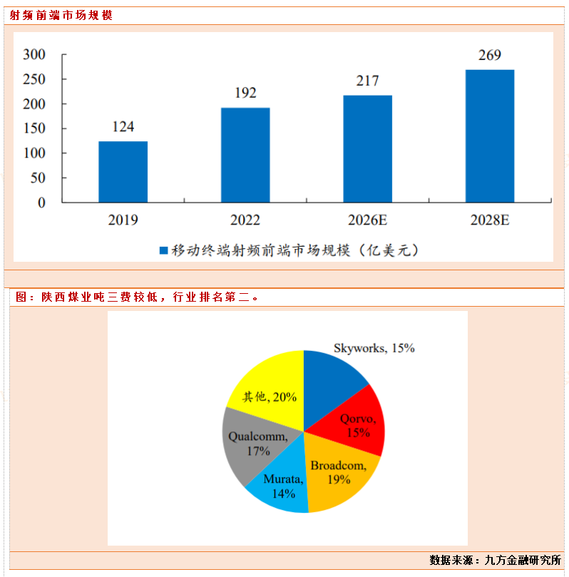 射频前端市场规模:根据Yole的统计数据,2019年全球移动终端射频前端市场规模124亿美元,至2022年增长至192亿美元,3年年均复合增速达15.69%。Yole预计,全球移动终端射频前端市场规模在2028年有望达到269亿美元,6年年均复合增速为5.78%,整体表现为稳健增长的态势。射频前端行业由国外龙头主导,呈现寡头垄断格局。射频前端的全球主要厂商包括Skyworks、Qorvo、博通、村田等,龙头基本为日美企业,前四大龙头合计占全市场总份额的68%,集中度高。国内射频前端企业目前在全球的市场份额占比较小,国内龙头卓胜微。