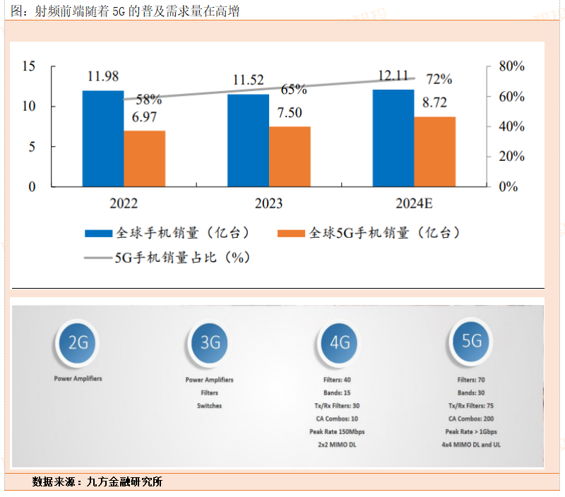 射频前端需求逻辑驱动:射频前端的需求主要受到两个主要因素影响,一方面受到消费电子周期影响,一方面受到技术迭代影响。手机销量的增长和5G手机渗透率的提升对射频前端的需求是正向提升。根据TechInsights的统计及预测数据,2023年全球智能手机销量为11.52亿台,相对于2022年11.98亿台略有降低,并预计2024年将回暖至12.11亿台。5G手机方面,TechInsights预计2023-2024年全球销量分别为7.50亿台和8.72亿台,销量占比分别为65%和72%,较2022年58%的销量占比提升显著。随着全球手机销量的回暖叠加5G渗透率进一步提升,移动射频前端需求有望迎来新的增长。相比于4GLTE应用的2*2MIMO,5GUHB(高频段,N77/N78/N79)采用的是4*4MIMO,即每个频段由原来的2条接收通路增加至4条通路,新增频段部分RX通路数量增加,需要的射频器件也随之增加。根据Skyworks的统计数据,当5G发展到成熟阶段的时候,全网通的手机射频前端的Filters数量会从40个增加为70个,Bands数量亦会由15个增为30个。