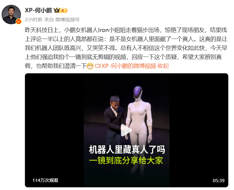 为回应公众好奇,今日,何小鹏在其个人微博发文表示,“总有人不相信这个世界变化如此快,今天早上他们强迫我拍个一镜到底无剪辑的视频,回应一下这个质疑,希望大家辨别真假,也帮助我们澄清一下。”