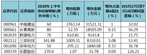 证券时报•数据宝统计,448只上半年业绩增长超过50%的个股中,自5月17日至7月16日期间股东增持的共有8只,其中,中南建设上半年净利润增长60%,股东增持3763.14万股,增持股数最多。