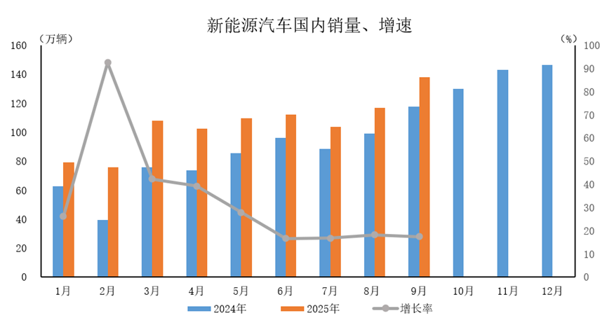 2025年9月,新能源汽车国内销量138.2万辆,环比增长18%,同比增长17.5%。2025年1-9月,新能源汽车国内销量947万辆,同比增长28.1%。