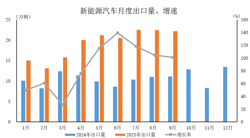 2025年9月,新能源汽车出口22.2万辆,环比下降0.9%,同比增长1倍。2025年1-9月,新能源汽车出口175.8万辆,同比增长89.4%。