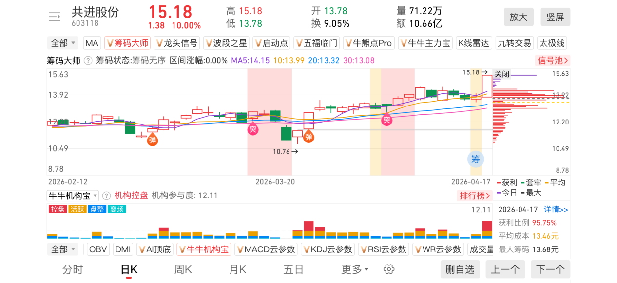 2)20260417-共进股份-603118-【筹码大师】和【牛牛机构宝】-近期出现弹信号且底部量柱由绿转红