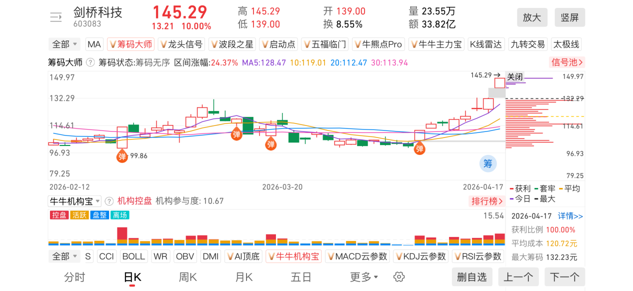 1)20260417-剑桥科技-603083-【筹码大师】和【牛牛机构宝】-近期出现弹信号且底部量柱由绿转红