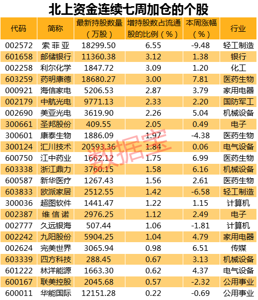 从持股比例变动情况来看,索菲亚为获加仓幅度最大个股,相比七周前北上资金持股比例增加了6.55个百分点;其他加仓较多的还有邮储银行利尔化学药明康德海信家电等。