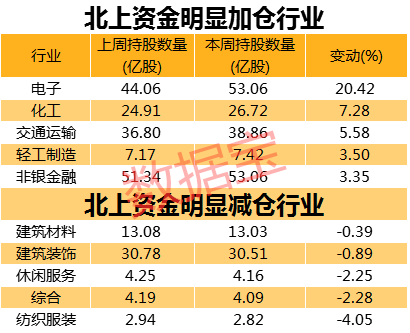 证券时报·数据宝统计显示,本周北上资金持股数量环比增加行业有21个。电子、化工、交通运输等3个行业持股数量环比增加5%以上。其中,电子行业持股数量环比增加最为显著,北上资金本周末持有该行业53.06亿股,环比增加20.42%。