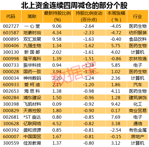 减仓的行业中,纺织服装行业减仓最为明显,本周北上资金持有该行业2.82亿股,环比下降4.05%;减仓较多的其他行业包括综合、休闲服务等。