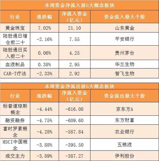 概念板块方面,本周黄金珠宝、陆股通日增仓前二十等概念板块资金呈现净流入,其中黄金珠宝概念净流入21.1亿元居首。