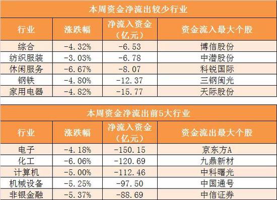 28个申万一级行业中,本周无一行业实现资金净流入,电子、化工、计算机、机械设备等行业资金净流出规模居前,其中电子行业净流出150.15亿元居首。