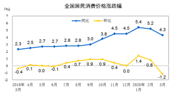 今早2020年3月重磅经济数据出炉。3月CPI(居民消费价格指数)同比上涨4.3%,重回“4”时代,环比下降1.2%,创近一年新低。从环比看,食品价格由上月上涨4.3%转为下降3.8%,影响CPI下降约0.9个百分点,是带动CPI由涨转降的主要因素。