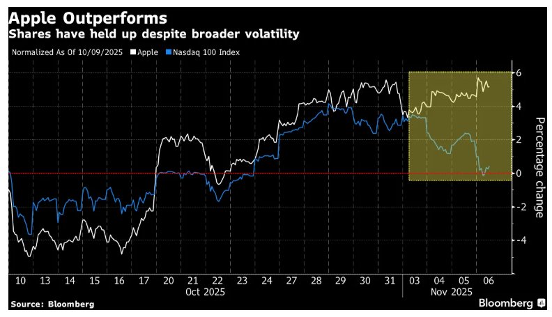 这种跑赢大盘的表现,标志着苹果股价回归于“剧烈波动中的避险本色”——过去每逢市场动荡,苹果无比强大的现金创造能力以及坚如磐石的资产负债表都让它相对而言毫发无损。而今年大部分时间里,由于全球投资者们追逐围绕人工智能的投资狂潮,这只科技巨无霸股票在今年多数时间段一直落后于美股大盘以及英伟达、台积电等AI算力产业链领军者们。