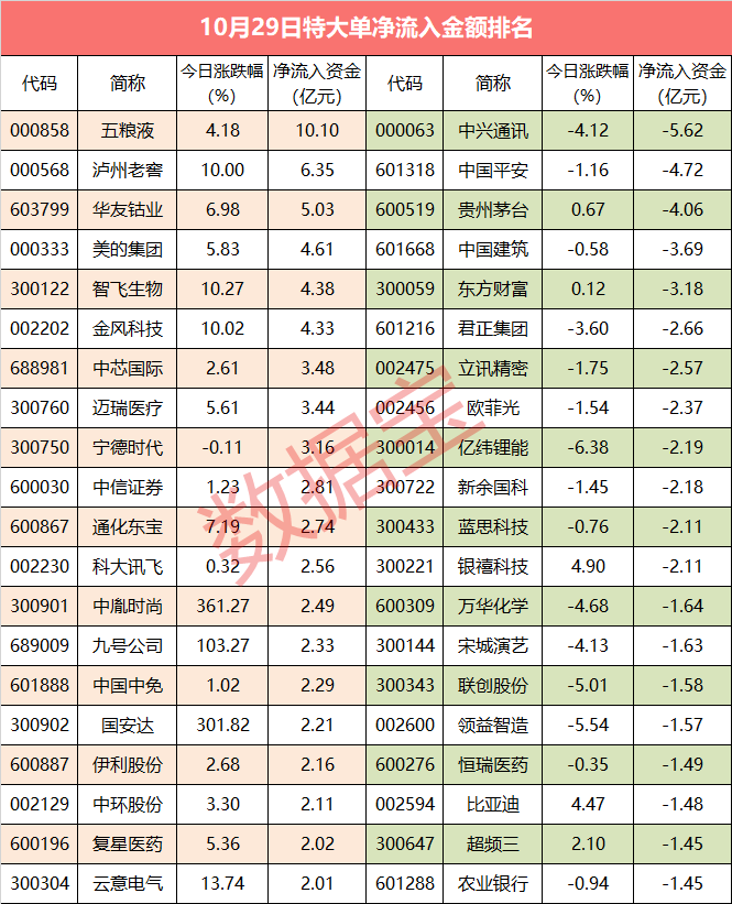 个股来看,两市有3只股票获特大单净流入超5亿元。五粮液特大单资金净流入居首,为10.1亿元,晚间公司披露三季报显示,净利润为36.9亿元,同比增长15.03%。目前五粮液牢牢占据深市市值第一的位置,今日市值距万亿大关仅差一步。山西证券研报称,五粮液在严格渠道管控下批价超预期,五粮液挺价超预期,增强行业信心,为千元以下白酒打开价格空间。紧随其后是泸州老窖和华友钴业,特大单资金净流入分别为6.35亿元和5.03亿元。