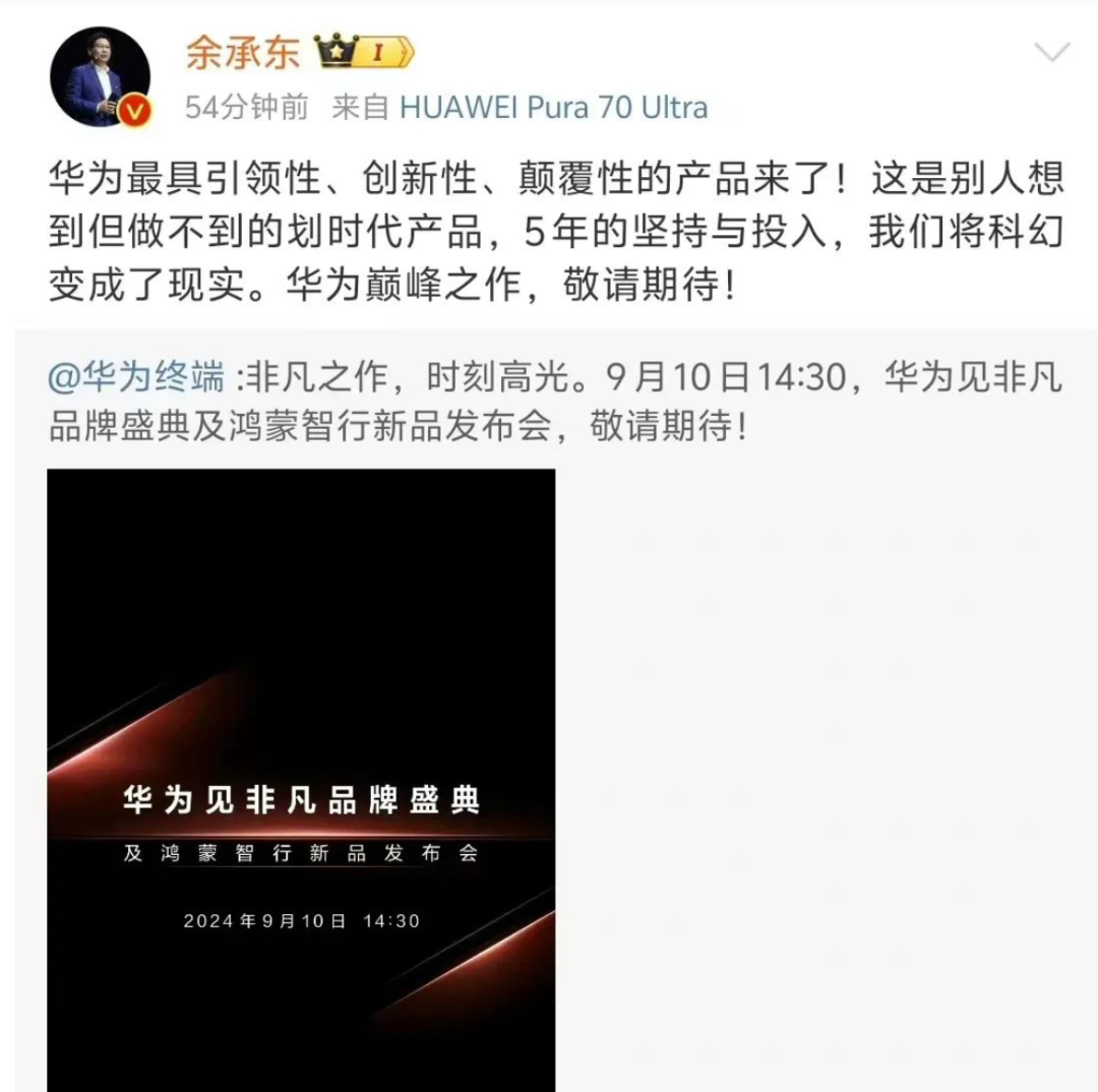 9月2日上午,华为终端发消息称:“非凡之作,时刻高光。9月10日14:30,华为见非凡品牌盛典及鸿蒙智行新品发布会,敬请期待!”