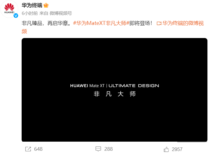 继9月2日预热新产品之后,9月3日华为终端发布一段预热视频,视频结尾公布了新品将会命名为华为Mate XT非凡大师。