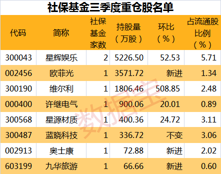 统计显示,社保基金新建仓的3只股为欧菲光、奥士康、九华旅游,其中,欧菲光最新持有3571.72万股,另外两只持股量不足百万股。增持的个股中,维尔利增持比例最多,三季度持有1806.46万股,环比增持超5倍,星辉娱乐增仓幅度也超50%。