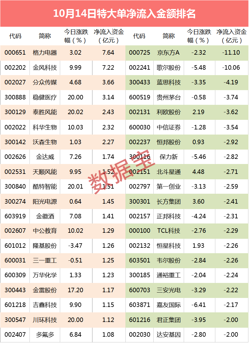今日有24股大单资金流入超亿元。格力电器以7.64亿元的金额流入居首,股价涨幅3%。昨日晚间,公司发布公告称,10月10日收到公司大股东珠海明骏提议公司使用自有资金以集中竞价方式回购公司股份,回购资金总额不低于人民币30亿元,不超过人民币60亿元,回购价格不超过70元/股。这是格力电器时隔半年筹划的第二次巨额回购,截至9月30日,累计回购金额为51.82亿元。