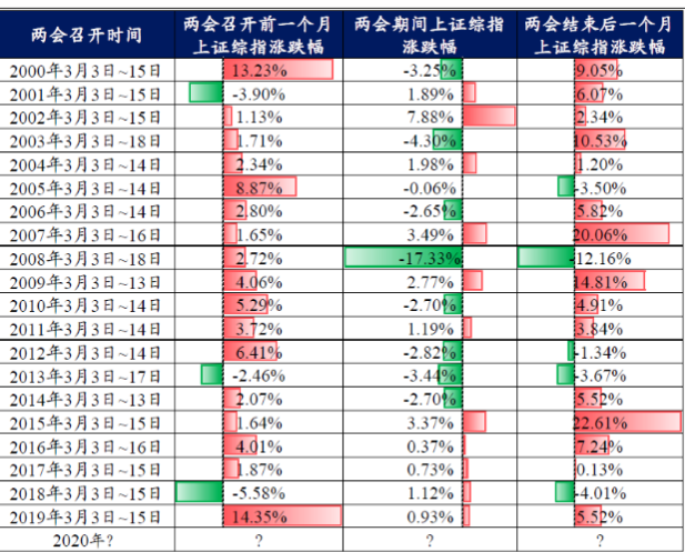 若将时间周期拉长,回顾近年历次两会前后行情变化,数据显示,两会召开前一个月上证指数涨多跌少,近20年两会前仅3次出现下跌,17次出现上涨,上涨概率85%。在两会期间上证指数整体表现摇摆不定,在两会结束后,上证综指整体表现较好。