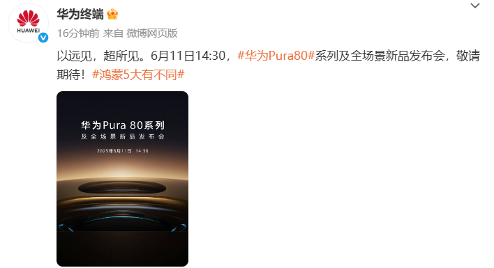 据华为终端消息,华为Pura 80系列及全场景新品发布会将于6月11日14:30举办,届时将正式发布华为Pura 80系列新机。