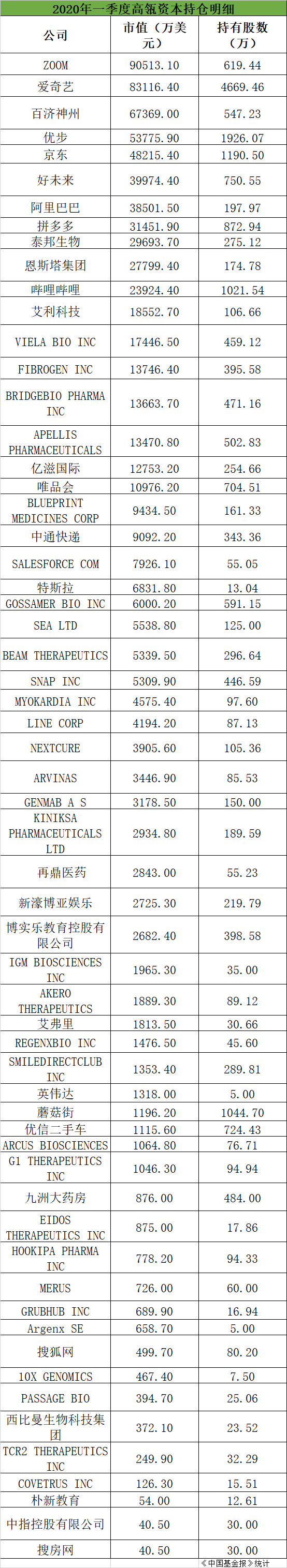 前五大重仓股分别是ZOOM、爱奇艺、百济神州、优步和京东,持有市值分别为9.1亿美元、8.3亿美元、6.7亿美元、5.4亿美元和4.8亿美元。
