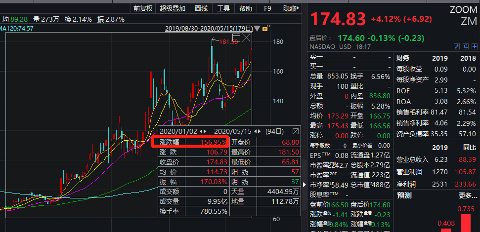 疫情期间由于远程办公、在线教育需求暴涨,主打多人视频会议的ZOOM受到越来越多的关注,全球用户激增,市值逆势上扬。一季度ZOOM股价涨幅达到115%,二季度继续上扬,截至接着发稿,ZOOM今年的涨幅已经超过150%。