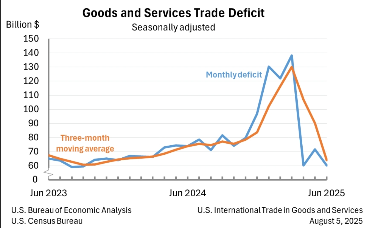6月货物和服务逆差下降,主要因货物逆差减少114亿美元至859亿美元,服务顺差增加1亿美元至257亿美元。