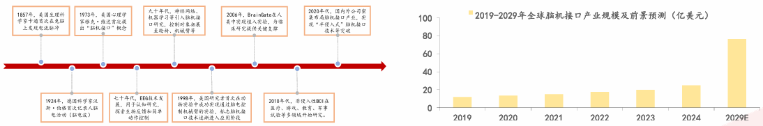 图:全球脑机接口发展历程 图:全球脑机接口产业规模及前景预测 |