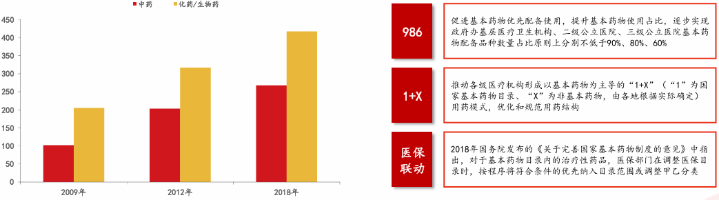 国家基本药物目录动态调整更新,根据基药目录管理办法,原则上每三年调整一次,实际调整可能会受外部复杂因素影响有所推迟。参照2018年基药目录版本,中药品种数量占基药目录总品种数量的40%左右。2019年国务院办公厅发布《关于进一步做好短缺药品保供稳价工作的意见》,文件强调促进基本药物优先配备使用和合理用药,提出“986”和“1+X”等战略要求。同时,2018年国务院发布的《关于完善国家基本药物制度的意见》中指出,对于基本药物目录内的治疗性药品,医保部门在调整医保目录时,按程序将符合条件的优先纳入目录范围或调整甲乙分类。在政策鼓励下,新品种进入新版基药目录后,有望享有政策红利实现销售快速放量。