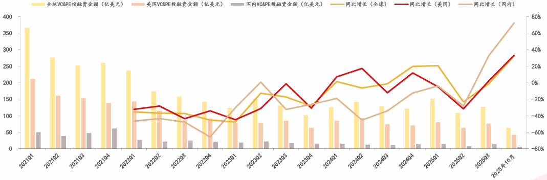 创新药投融资持续回暖,新药研发有望进入新一轮的投入周期。根据Crunchbase的数据,全球、美国、国内创新药VC&PE投融资金额同比增速逐步恢复正增长。其中,2025年10月全球、美国、国内创新药VC&PE投融资金额分别同比增长32%、33%、72%,创新药投融资回暖明显。