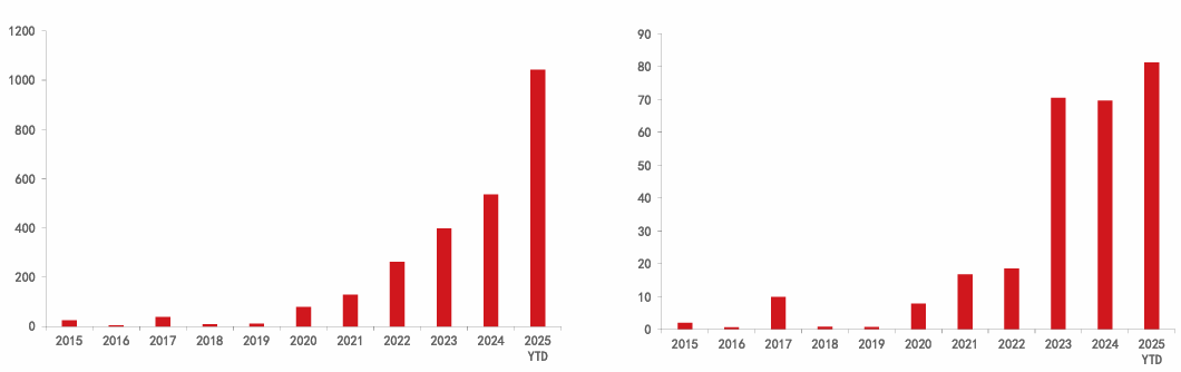根据药渡数据库,截止2025年10月底国内创新药领域已有175项海外授权BD交易达成,海外授权交易合同总金额已达1042亿美元,海外授权交易BD首付款已达81亿美元,交易总金额与首付款双双超越2024年全年数据。
