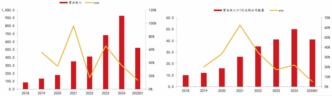 图:Biotech 近年营收变化(亿元)图:Biotech 2018-2025H1营收>1亿元的数量变化 |