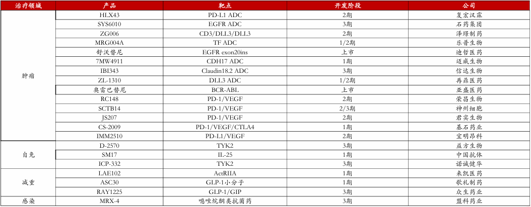寻找下一个可能海外授权的重磅品种。国内市场医保控费背景下,产品海外授权有望打开海外市场,从估值角度也有望为企业带来海外市场增量市值;根据我们梳理目前尚有多个肿瘤、自免、减重、感染领域的产品有望实现海外授权,其中不乏重磅预期产品。