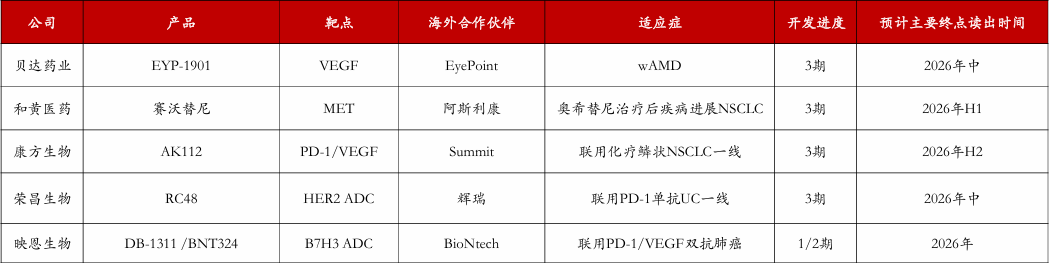 海外数据催化值得关注,多个药物有望于2026年读出海外关键数据。自2018年国产创新药海外授权兴起以来,已有多个国产新药实现海外授权,部分早期授权的产品已进入海外数据兑现阶段,例如贝达药业的EYP-1901、和黄医药的赛沃替尼、康方生物的AK112等均有望于2026年读出关键临床数据。