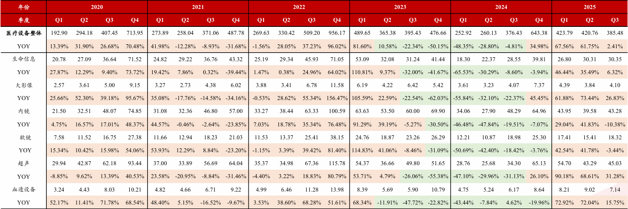 2023H2-2024H1,在高基数、行业整顿和医疗设备更新落地延后的背景下,行业终端出现承压。2024Q4开始,随着前期行业整顿的大面完成和设备更新的落地和常规采购的复苏,医疗设备各细分终端需求均呈现出持续性的回暖。