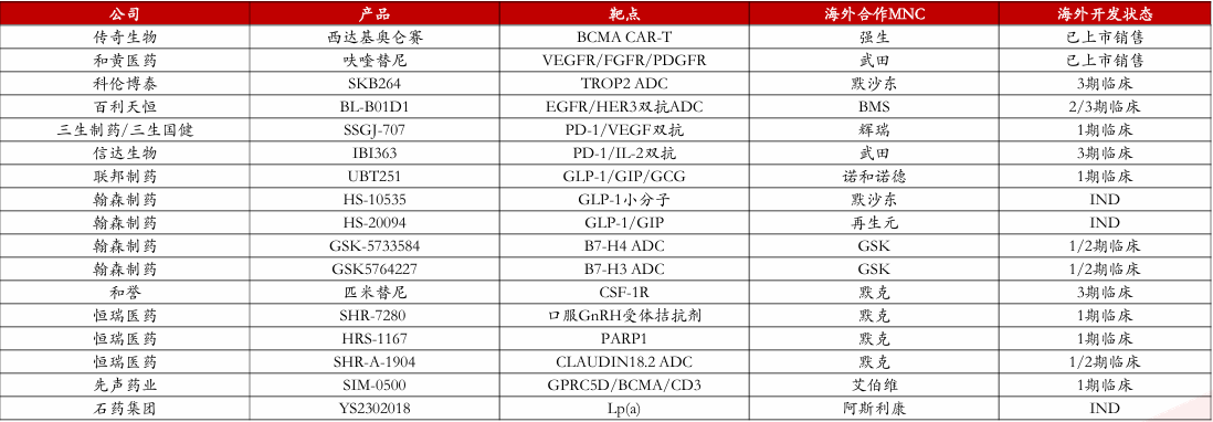 已授权MNC的产品未来海外放量确定性高。我们认为已获MNC认证(即已授权MNC)的中国创新药品种具备以下特点:1)主要以工程改造创新为主,未来成药确定性较高;2)MNC销售实力强,未来海外市场放量确定性高;3)具备较大的市场空间。基于上述特点,对于已有重磅产品授权MNC的相关标的,我们认为其海外市场估值有望随MNC推进临床试验、读出海外数据等事件的发生而逐渐提升(例如科伦博泰等)。