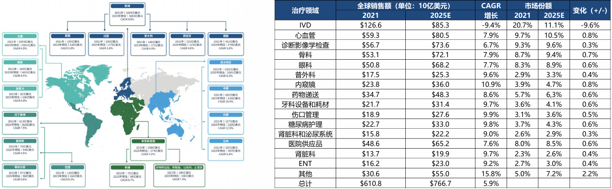 图:全球不同地区医疗器械市场的规模及预测 图:全球细分领域器械市场规模(10亿美元) |