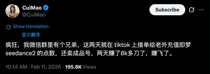 还有网友声称,通过给外国人充值Seedance 2.0的积分和倒卖成品账号,有人在两天内赚了8000多美元。