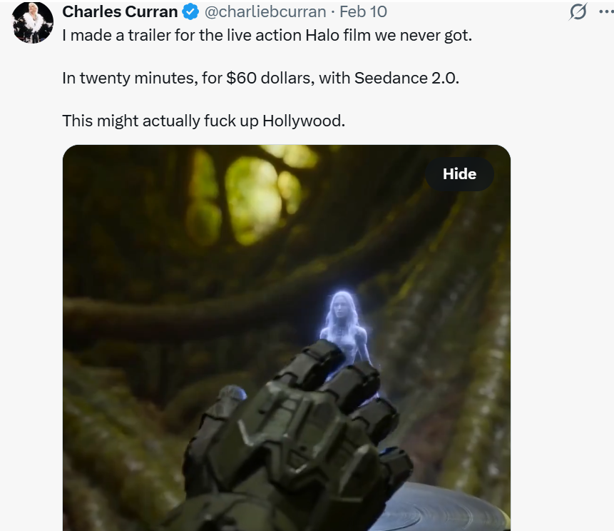 好莱坞导演Charles Curran也在X上发帖称,自己在20分钟内花费60美元用Seedance 2.0制作完成了一版真人电影预告片,Seedance说不定将颠覆整个好莱坞。