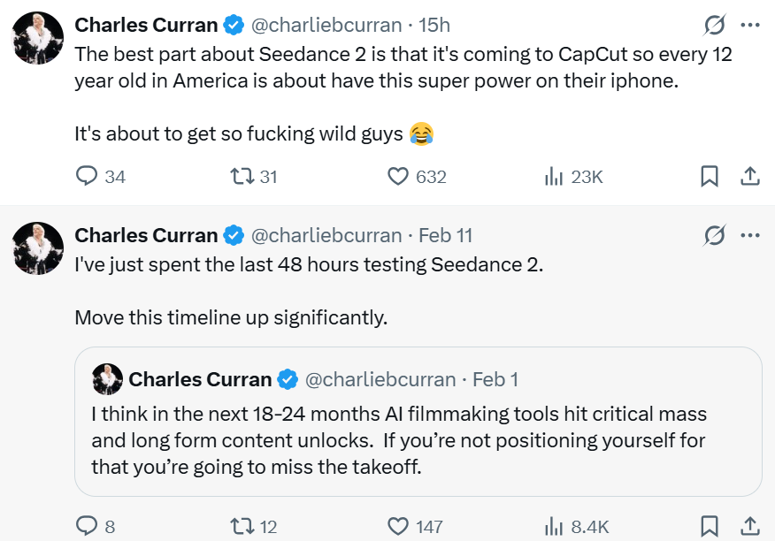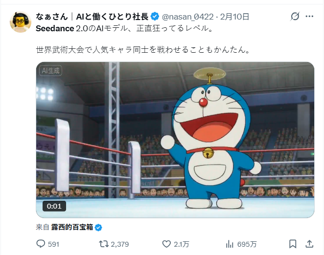 Seedance 2.0制作的视频在X上轻松获得了百万次的浏览