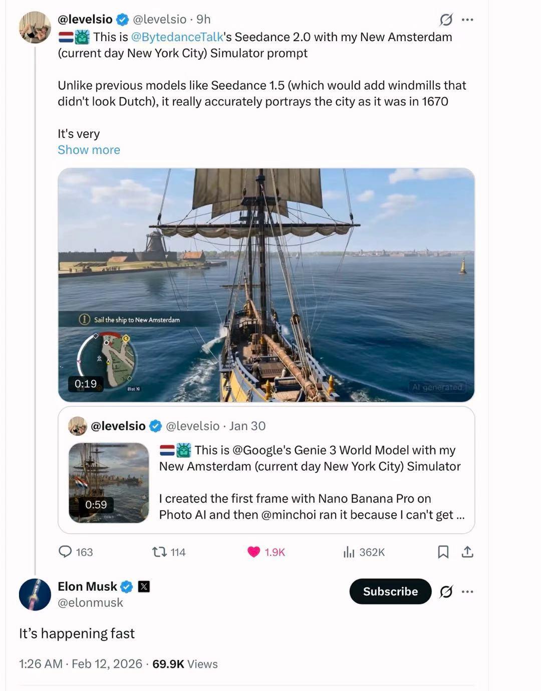 就连全球首富马斯克也在转发某个网友有关Seedance的评论时,感慨模型发展速度快(It's happening fast)。