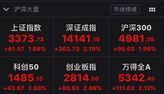 11月9日,A股三大股指集体上涨,沪指大涨1.86%,报3373.73点。