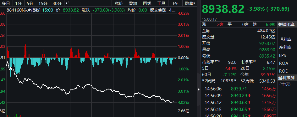 行业方面,芯片链集体大跌,市值近两千亿的韦尔股份跌停,澄天伟业、中微公司等跌幅明显。芯片指数狂泄近4%。
