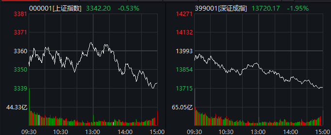 周三,A股三大股指集体杀跌。沪指盘中曾短暂翻红,受科技股下挫影响,深证成指、创业板指则单边下行。上证指数收盘跌0.53%报3342.2点;深证成指跌1.95%报13720.17点;创业板指跌3.31%报2681.52点,创两个月最大单日跌幅。两市成交额进一步萎缩,约8700亿元;北向资金净卖出近10亿元,但沪股通净买入近25亿元,深股通净卖出超34亿元。