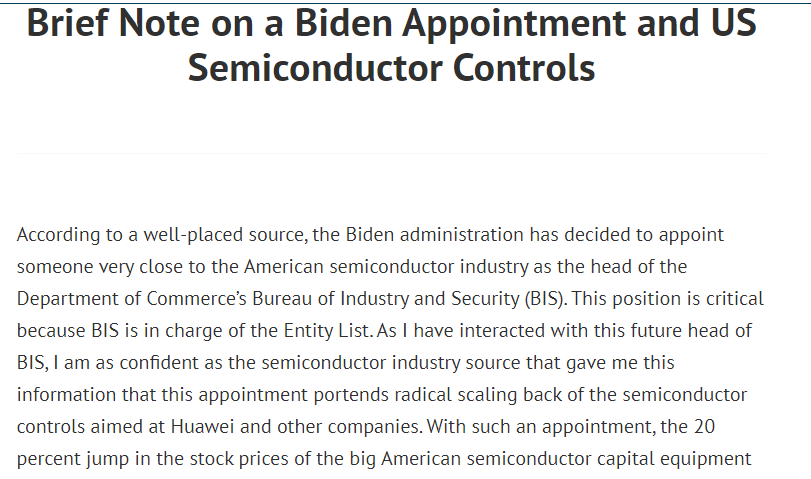 有外媒报道,一位知情人士说,拜登政府已决定任命一位与美国半导体产业非常接近的人为商务部工业与安全局(BIS)的负责人。该职位至关重要,因为BIS负责实体清单。当我与BIS的未来负责人进行互动时,我有信心给半导体行业消息人士提供了这样的信息,即该任命预示着针对半导体出口控制的根本缩减。有了这样的任命,事实证明,上周美国大型半导体资本设备公司的股价上涨了20%,这不仅仅是非理性的繁荣。