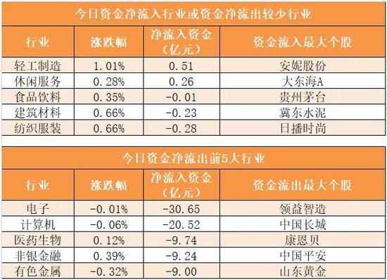 28个申万一级行业中,2个行业实现资金净流入,其中轻工制造行业净流入0.51亿元居首。