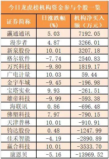 盘后龙虎榜数据显示,机构现身16股,其中瀛通通讯等6股呈现机构资金净买入,康恩贝等10股呈现机构资金净卖出。