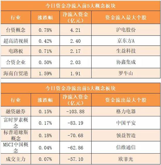 概念板块方面,今日台资概念、超高清视频、电路板等概念板块资金呈现净流入,其中台资概念净流入4.21亿元居首。