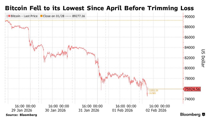 在周一,比特币这一全球最大市值加密货币一度下跌2.5%,跌至74,541美元,接近自唐纳德·特朗普重新回到白宫以来的最低水平——即重新回到此前“Liberation Day”(解放日)关税冲击后出现过的价格区域,也就是2025年4月7日当日触及的74,425美元。截至发稿,比特币交易价格有所回升,徘徊于76,000美元上方。