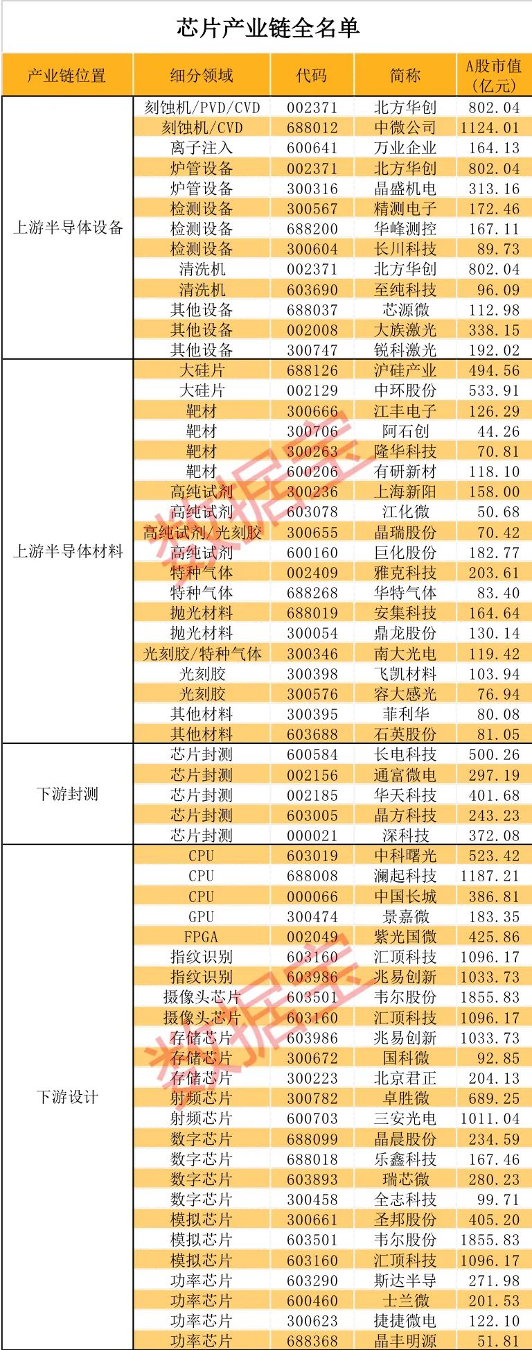 作为当前备受期待的国产芯片龙头中芯国际,其产业链上下游都有哪些公司?数据宝根据券商研报及上市公司整理出一份芯片产业链名单,其中北方华创、中微公司、南大光电、 汇顶科技、兆易创新、韦尔股份等布局了产业链的多个环节。具体名单见下表:
